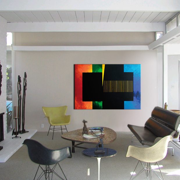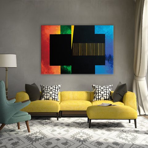 Obraz na płótnie naciągniętym na drewnianą ramę. Wykonany w technice własnej i akrylu ze złotem. Boki obrazu są zamalowane na czarno co ładnie odcina go od jasnej ściany.